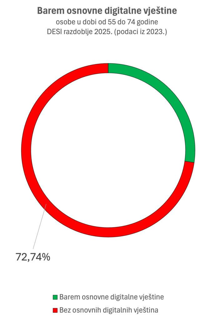 Prema DESI 2025 pokazateljima, samo 27,26% hrvatskih građana u dobi od 55 do 74 godine ima osnovne digitalne vještine. Budući da je prema Popisu stanovništva iz 2021. godine oko 1,7 milijuna građana starije od 50 godina, može se procijeniti da više od milijun osoba starijih od 55 godina nije u mogućnosti samostalno koristiti javne e-usluge.