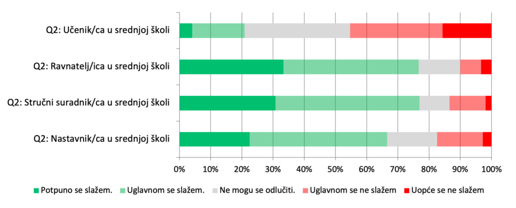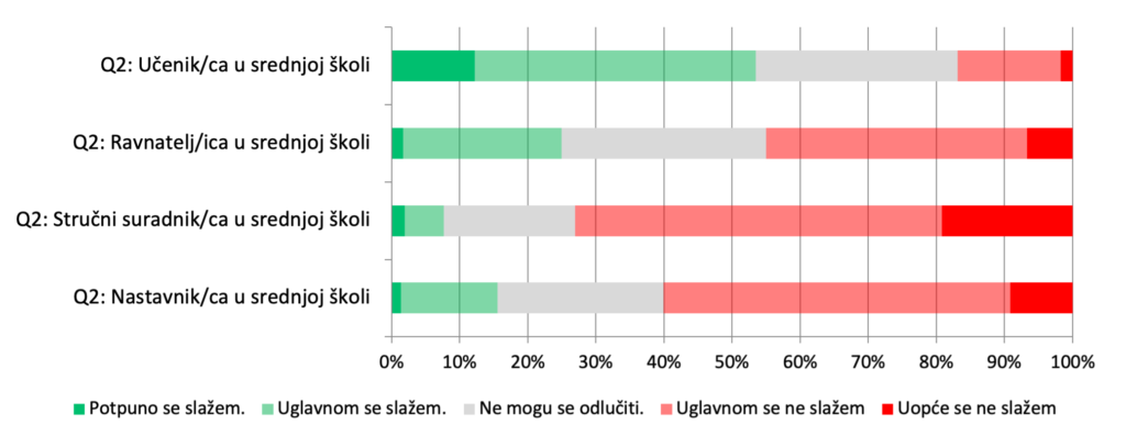 U našem istraživanju iz 2024. čak 67% nastavnika i 77% stručnih suradnika i ravnatelja navodi potrebu za edukacijom o komunikaciji s umjetnom inteligencijom. Za razliku od njih, gotovo pola učenika smatra da im takve edukacije nisu potrebne.